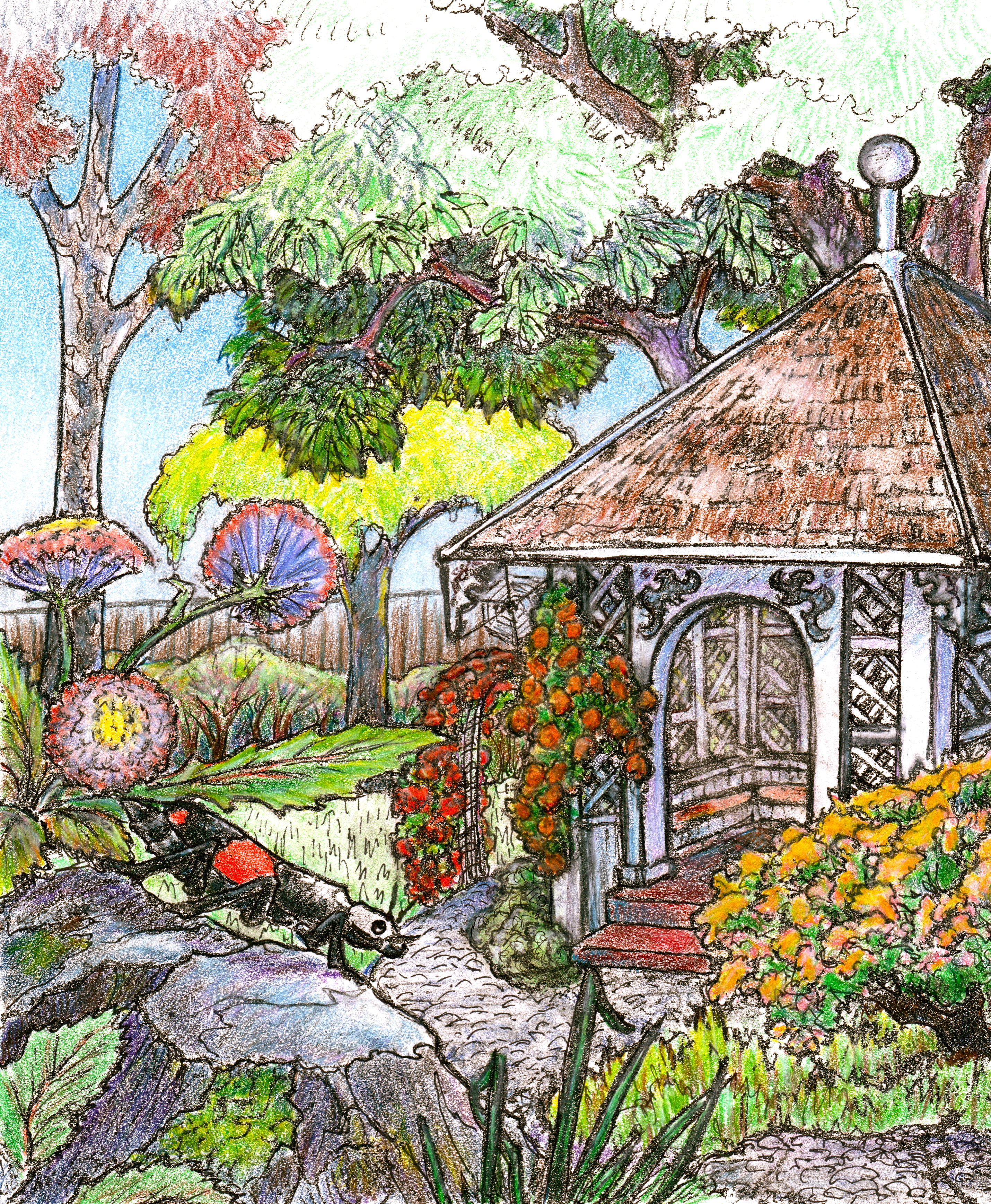 “Yes, I have to admit it is an attractive place,” returned my beetle. “Gingerbread on the eaves and roses hanging from the trellises. And shaded by a giant chestnut tree, a truly grand old dame that has stood there for many human lifetimes, I can tell you! Or at least, so I am told. So who should decide to try her luck there but Arabella. Shortsighted as she was, she still noticed the way the roses drooped nearly to the ground. (“You keep saying WAS!”I interjected. “Yes indeed, WAS it is!” my beetle retorted. “Now don’t interrupt!”).
